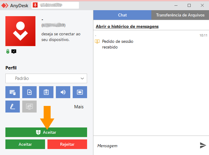 3- Quando a conexão for estabelecida, será solicitado a você aceitar a conexão remota, clique no botão “Aceitar” identificado na seta laranja.