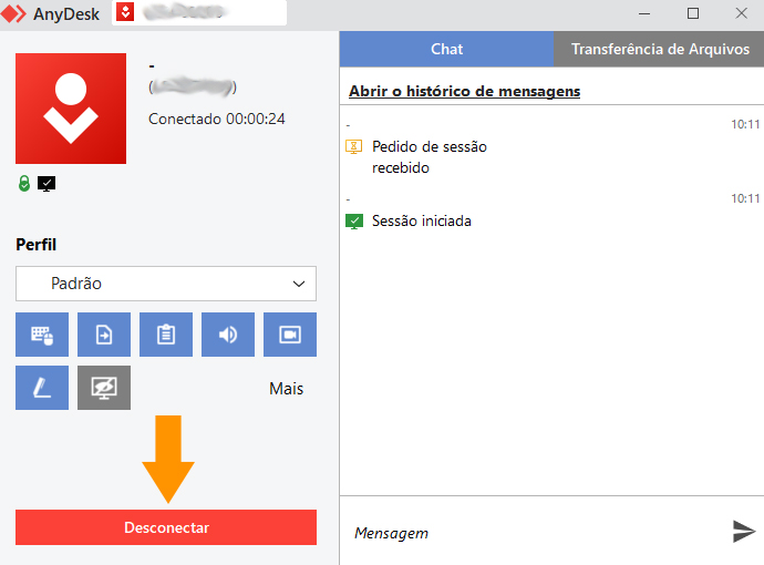 4- Após a finalização do acesso, você poderá finalizar a conexão clicando no botão “Desconectar” identificado na seta laranja.