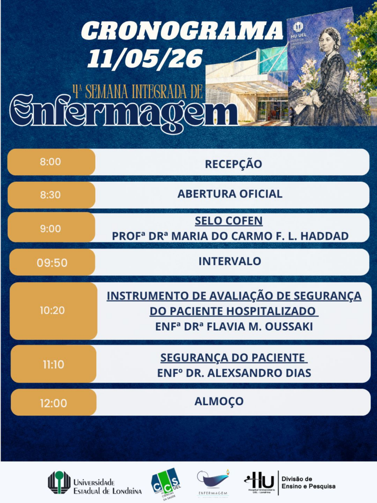 O HU-UEL, em parceria com o Departamento de Enfermagem do Centro de Ciências da Saúde (CCS), realiza a Semana Integrada de Enfermagem, com o tema: “Enfermagem que transforma: cuidado seguro, ensino e inovação no SUS”. O evento acontece em 11 de maio, no Anfiteatro do HU, das 8h às 18h, é aberto à comunidade acadêmica e aos profissionais da área da saúde.