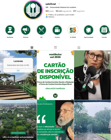 Os perfis no Instagram vinculados à Universidade Estadual de Londrina (UEL) fazem parte da comunicação institucional e devem seguir princípios que assegurem qualidade, coerência visual e alinhamento com os valores da administração pública.