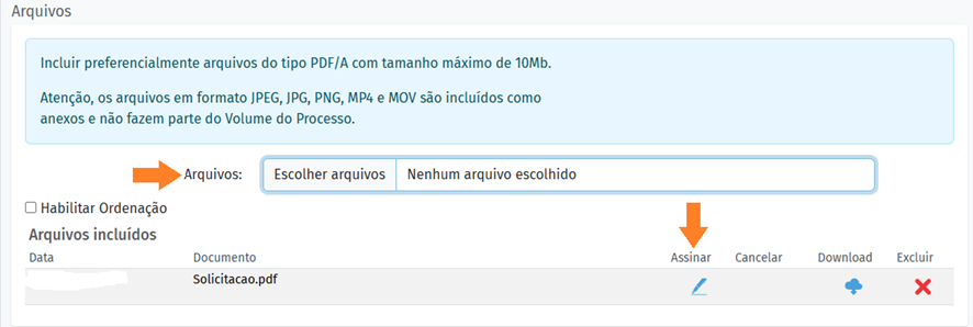 7-Na seção Arquivos, procure e selecione, um a um, todos os arquivos que deseja protocolar. Nesta etapa, os documentos inseridos podem ser excluídos e assinados.