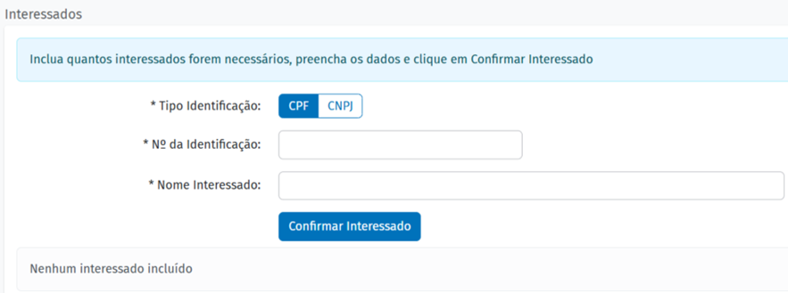 6-Na seção Interessados preencha seu CPF ou CNPJ no campo Nº da identificação, no campo Nome interessado informe seu nome. Clique em Incluir Interessado.