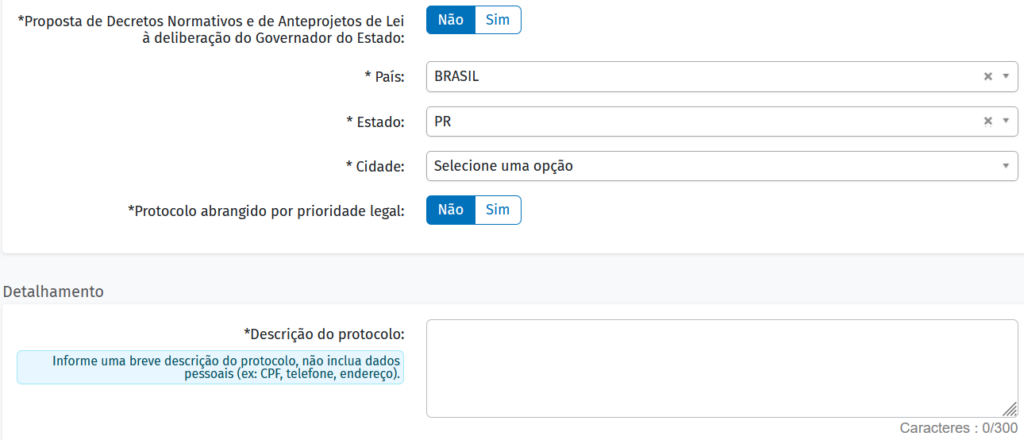 Descrição do protocolo: Informar um título com uma breve descrição do assunto, constará na capa do processo (não inclua dados pessoais: ex: CPF, telefone e endereço);
