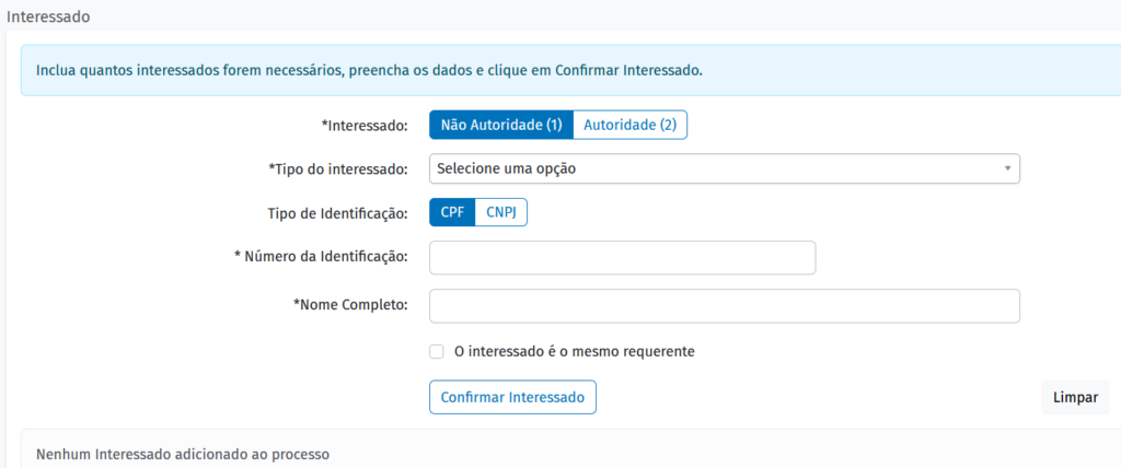 É possível incluir mais de um interessado, basta seguir as orientações para cada um deles, e os nomes aparecerão na lista de “Interessados incluídos no processo”.
