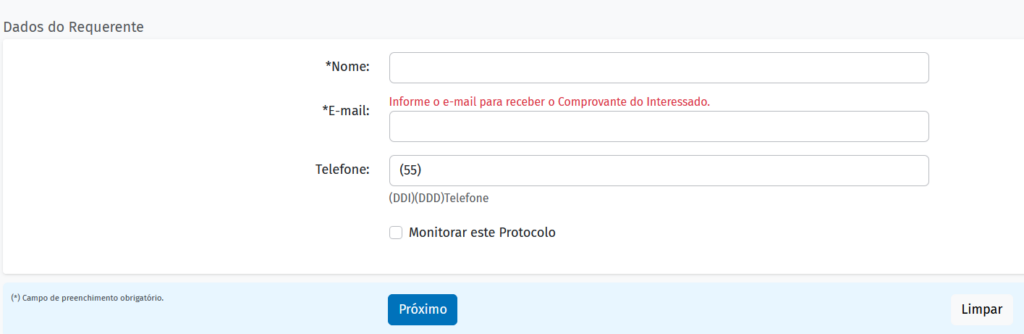 E-mail: Informar o e-mail que receberá o comprovante de abertura do processo e demais notificações;