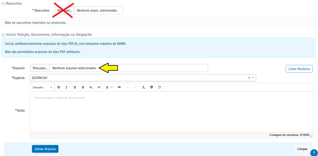 Caso não tenha documentos para incluir no processo, é necessário inserir um texto no campo Despacho e “Salvar Arquivo”;