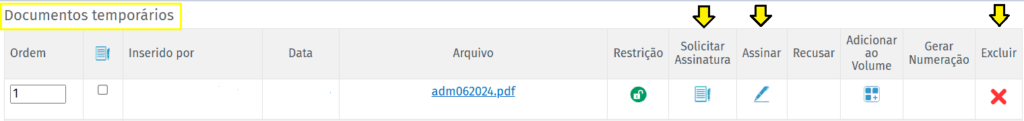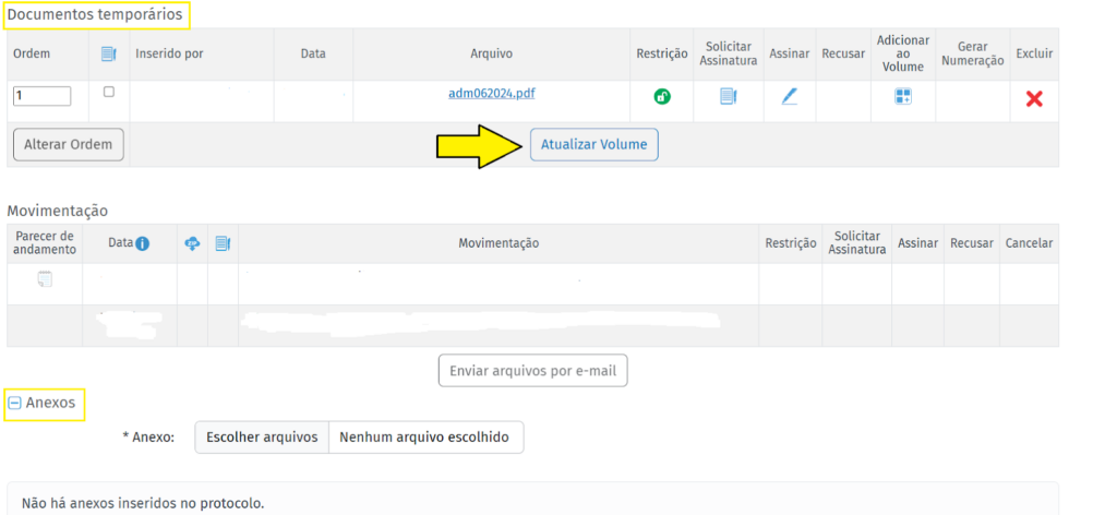 Após confirmar que os documentos estão corretos e assinados, basta clicar no botão Atualizar Volume para gerar o volume do processo. A partir daqui, os documentos não podem mais ser excluídos;