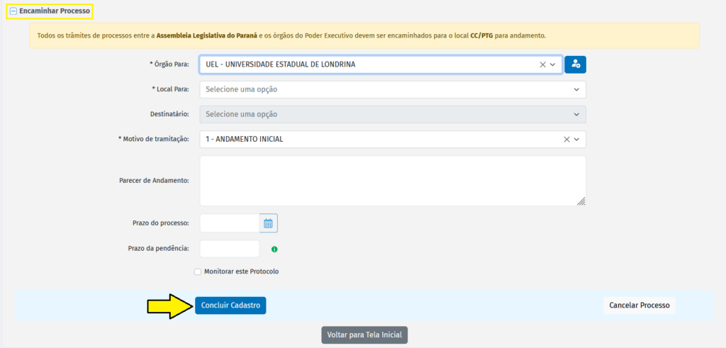 Finalização: Ao clicar no botão “Concluir Cadastro” o procedimento será finalizado e o processo encaminhado ao local de destino.