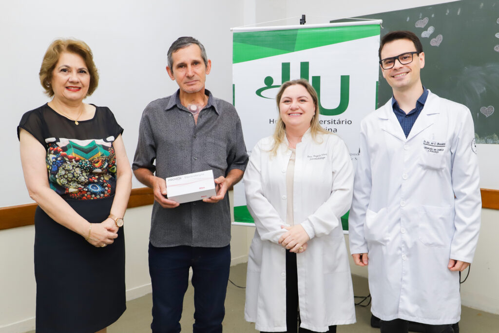 A cerimônia ocorreu no Ambulatório de Especialidade do HU (AEHU), e contou com a presença da superintendente do HU, Iara Secco, da diretora de Enfermagem, Flávia Oussaki, além do paciente e profissionais do Hospital.