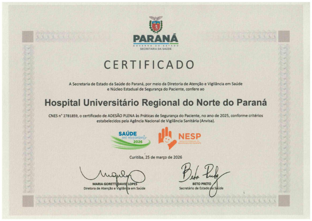 O Hospital Universitário da Universidade Estadual de Londrina (HU-UEL) conquistou, pelo terceiro ano consecutivo, a Certificação de “Adesão Plena” às Práticas de Segurança do Paciente, concedida pela Agência Nacional de Vigilância Sanitária (ANVISA), referente ao ciclo de avaliação de 2025. O HU-UEL foi o único hospital da macrorregião Norte a receber o Certificado.