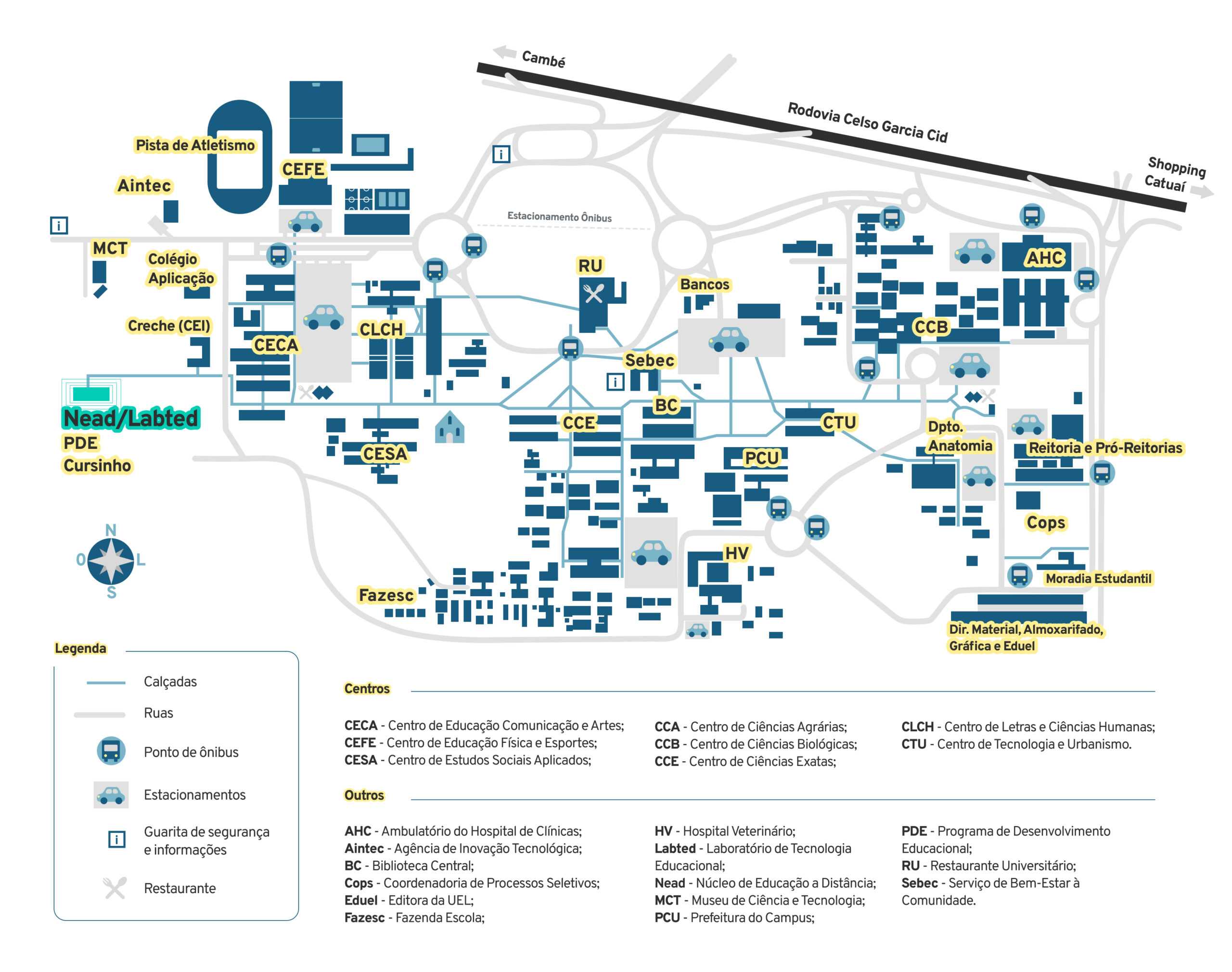 As equipes do Núcleo de Educação a Distância (Nead/UEL) e do Laboratório de Tecnologia Educacional (Labted/UEL) estão atendendo temporariamente no prédio do PDE, no campus da UEL.
