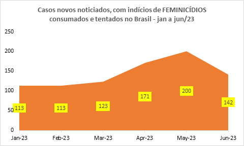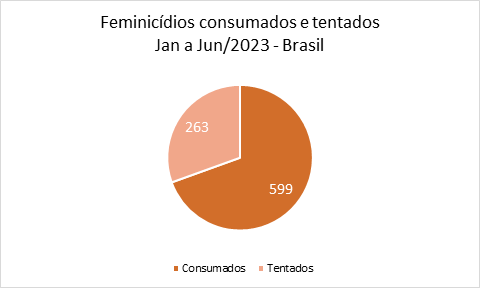 De janeiro a junho de 2023, o MFB registrou 862 feminicídios, sendo 599 consumados e 263 tentados.