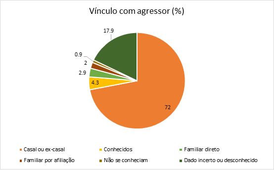 Dos 862 feminicídios consumados e tentados, em 72% o vínculo entre vítima e agressor era de casal ou ex-casal. Em aproximadamente 18% esta informação não estava esclarecida por ocasião da notícia. Os demais caso se distribuem entre vínculos de familiar direto, familiar indireto, conhecidos ou não se conheciam.