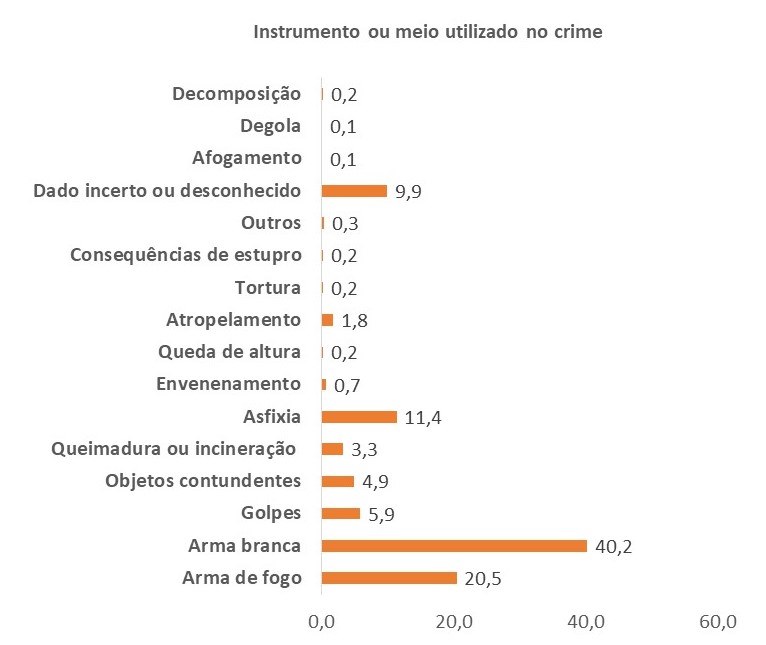 Entre os 862 feminicídios consumados e tentados, alguns crimes foram praticados com o uso de mais de um meio, arma ou instrumento. Arma branca foi o instrumento mais utilizado, em aproximadamente 40% dos casos.
