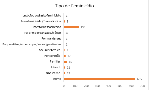 Em aproximadamente 75% dos casos, o feminicídio foi íntimo e em aproximadamente 15% dos registros o tipo de feminicídio era incerto ou desconhecido.