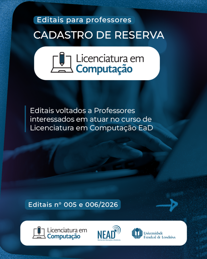 Estão abertas as inscrições para formação de cadastro de reserva de docentes interessados em ministrar aulas no curso de graduação em Computação, na modalidade Licenciatura EaD, da Universidade Estadual de Londrina (UEL). O edital nº 005/2026 abrange as disciplinas de:▪️Interação Humano Computador;▪️Bancos de dados;▪️Engenharia de Software.▪️Introdução às linguagens formais e compiladores;▪️Sistemas Operacionais. Já o edital […]