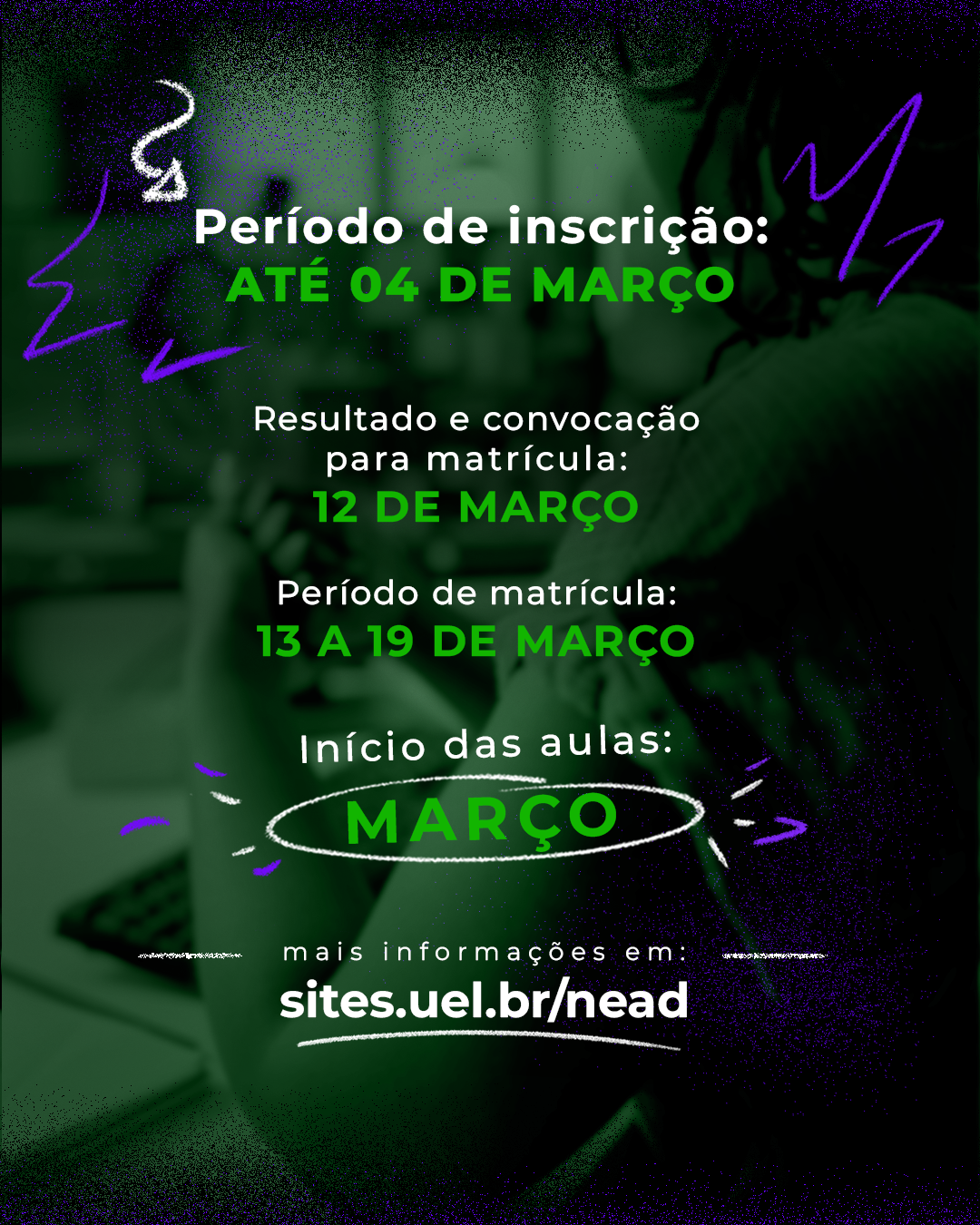 Mais informações sobre os cursos e os editais de seleção estão disponíveis no site do Núcleo de Educação a Distância, no endereço sites.uel.br/nead.