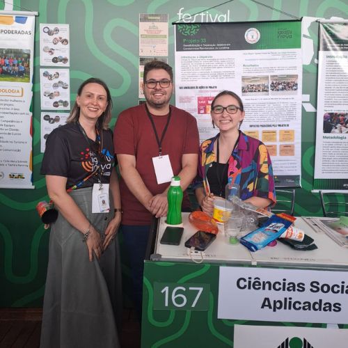 Os estudantes Ian Braziel Fernandes e Sophia Franco Vieira de Oliveira representaram a equipe técnica e pedagógica do Projeto 3S no Festival Iguassu Inova, realizado em Foz do Iguaçu (PR), entre os dias 22 e 25 de outubro. Eles integraram a comitiva da Universidade Estadual de Londrina (UEL), convidada para o evento. Durante o evento, eles participaram das atividades do Mundo Sapiens e expuseram, em um estande, os resultados e as ações desenvolvidas junto aos condomínios residenciais de Londrina.