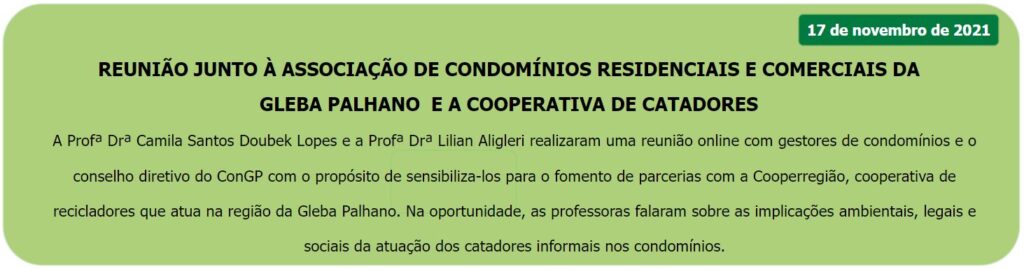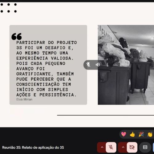 No dia 15 de abril foi realizada uma reunião online com mais de 55 participantes, cujo objetivo central foi apresentar os casos de condomínios que já tiveram sua gestão de resíduos modificada, a partir da intervenção do Projeto 3S.