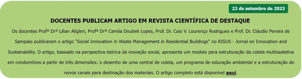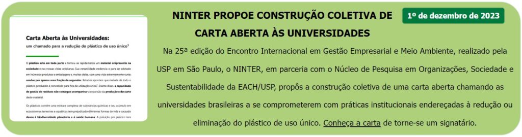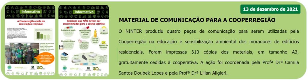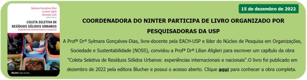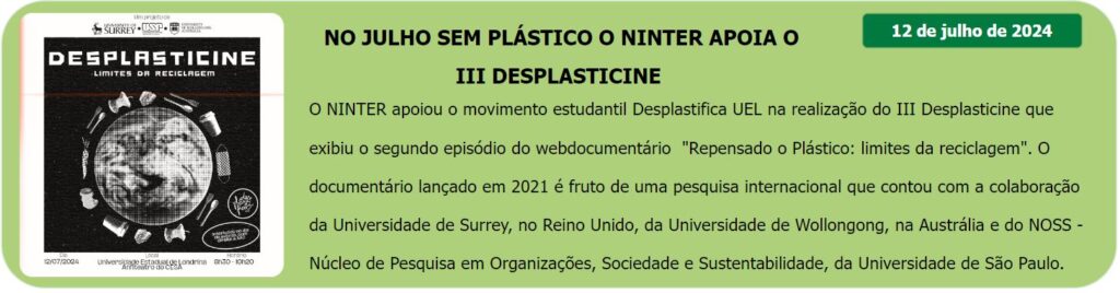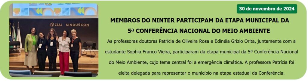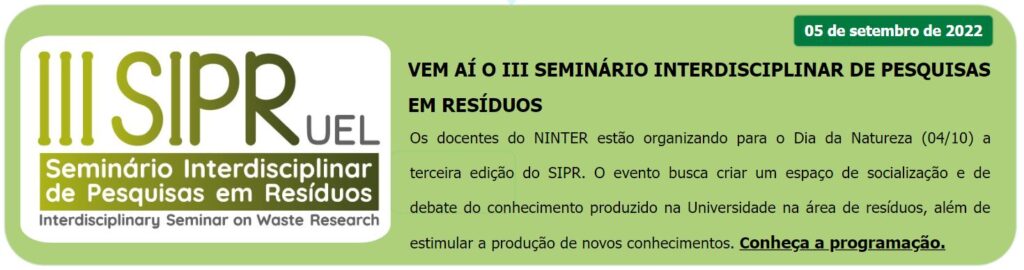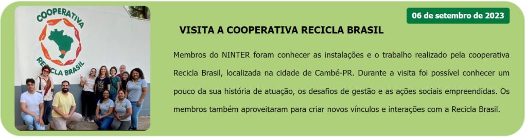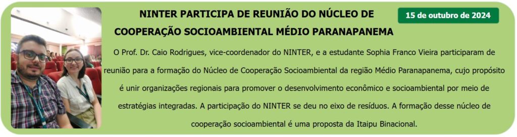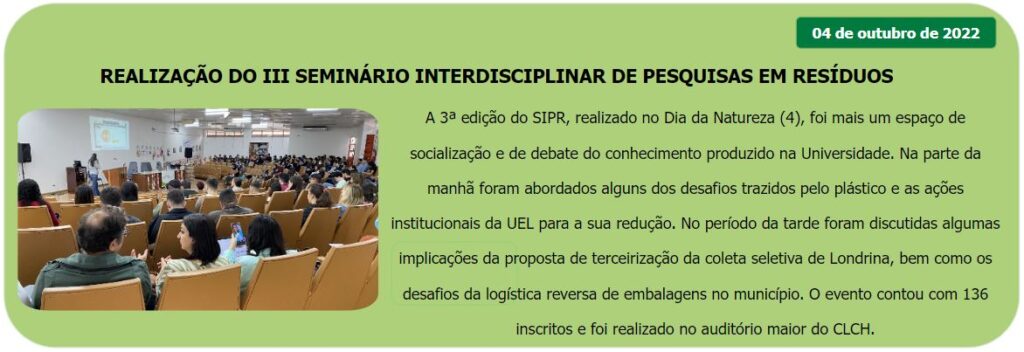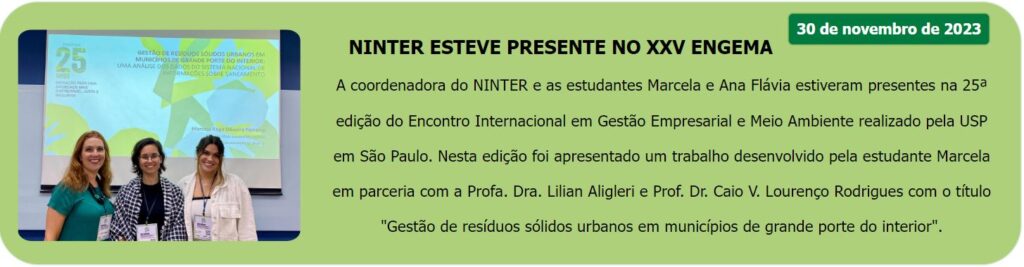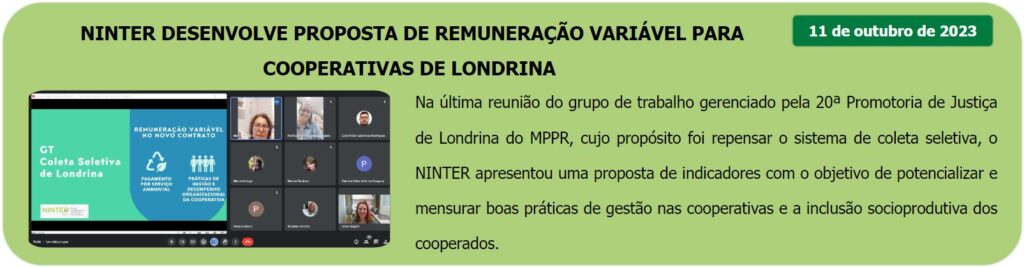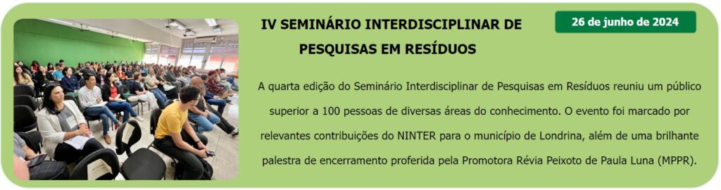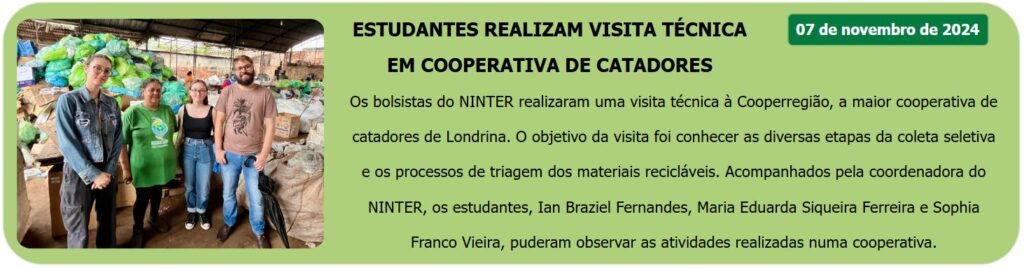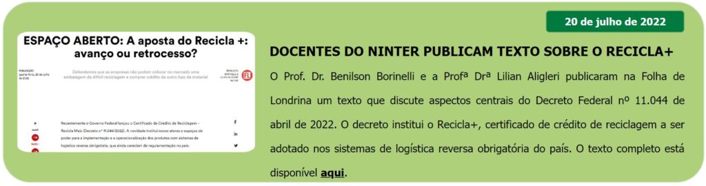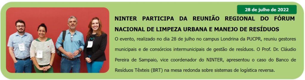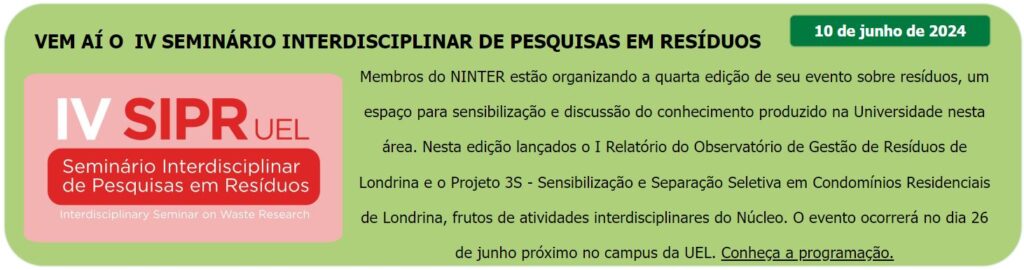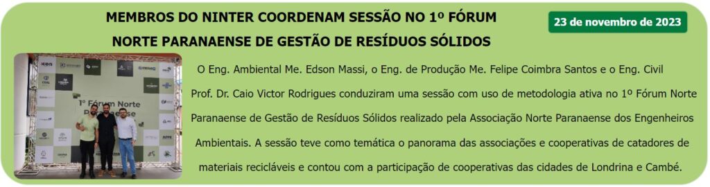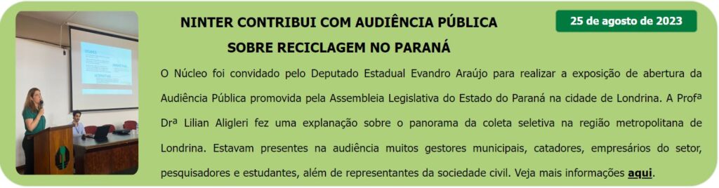 No dia 06 de novembro, a Profª Drª Lilian Aligleri representou o NINTER como palestrante em mais um painel do 3º Fórum Norte Paranaense de Gestão de Resíduos, realizado pela Associação Norte Paranaense dos Engenheiros Ambientais (ANPEA). A temática central do painel foi discutir o papel das cooperativas de reciclagem no avanço da economia circular. Durante o evento, foram apresentadas reflexões e resultados de levantamentos de dados sobre a realidade das cooperativas e associações de catadores da região de Londrina.