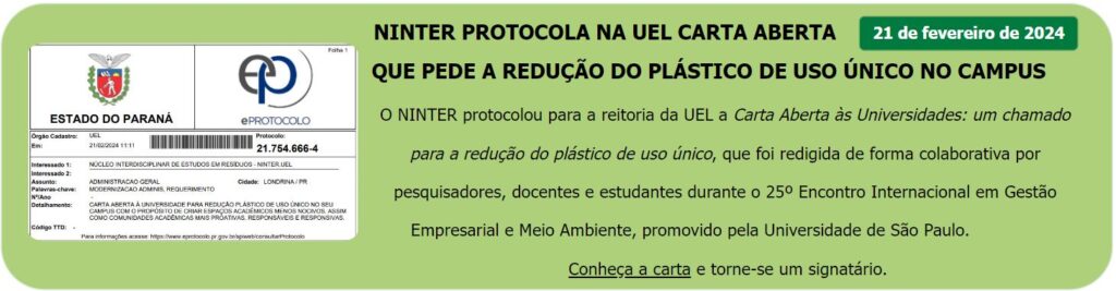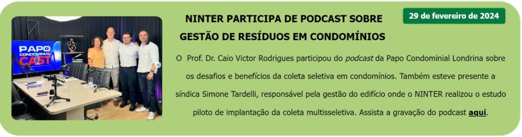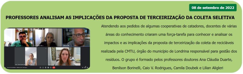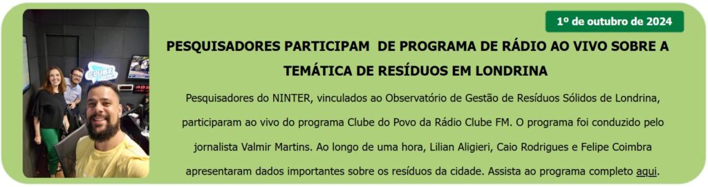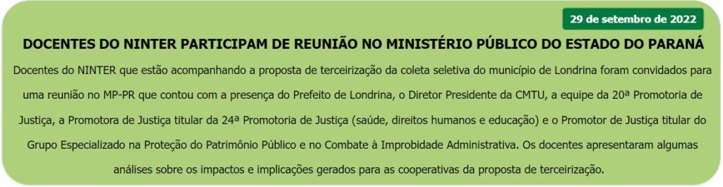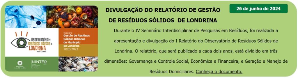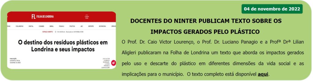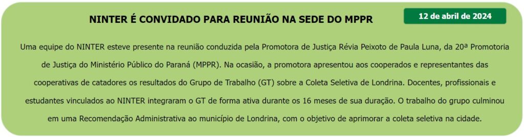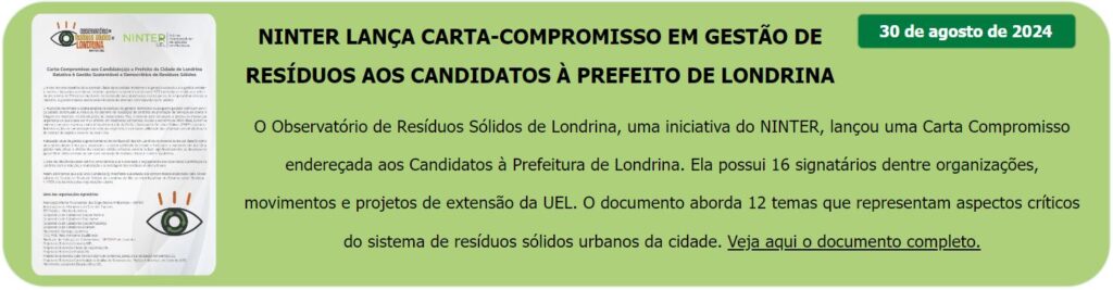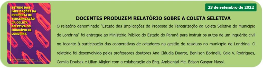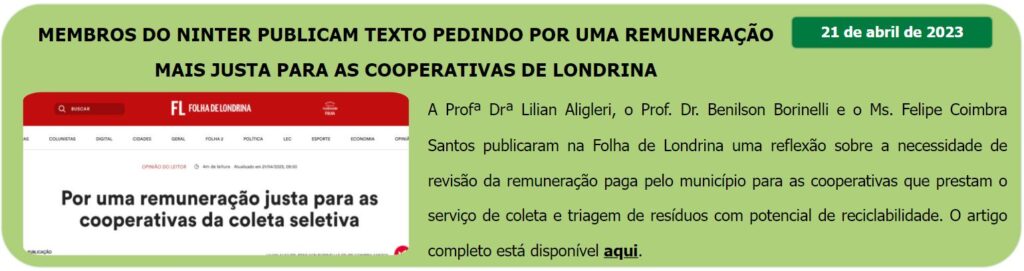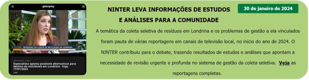 A edição da Folha de Londrina de 26 de abril destacou em sua capa a proposta elaborada pelo Grupo Técnico, instituído pelo Ministério Público do Estado do Paraná. O Núcleo Interdisciplinar de Estudos e Pesquisas em Resíduos Sólidos (NINTER) integrou este Grupo, que teve como objetivo balizar o novo contrato de coleta seletiva de Londrina.