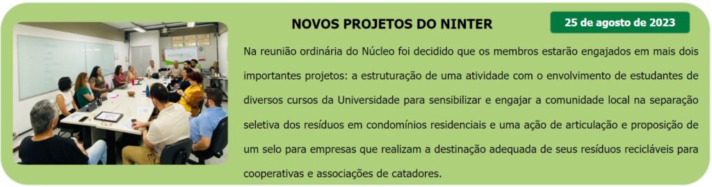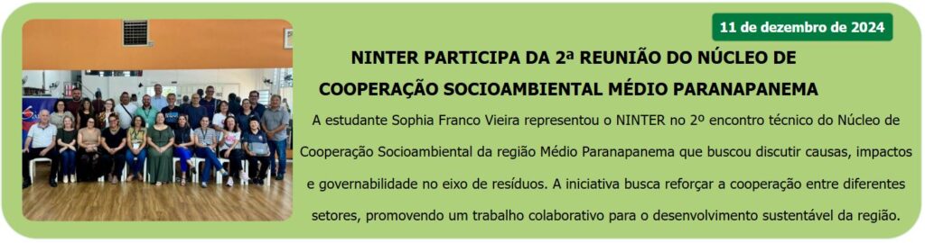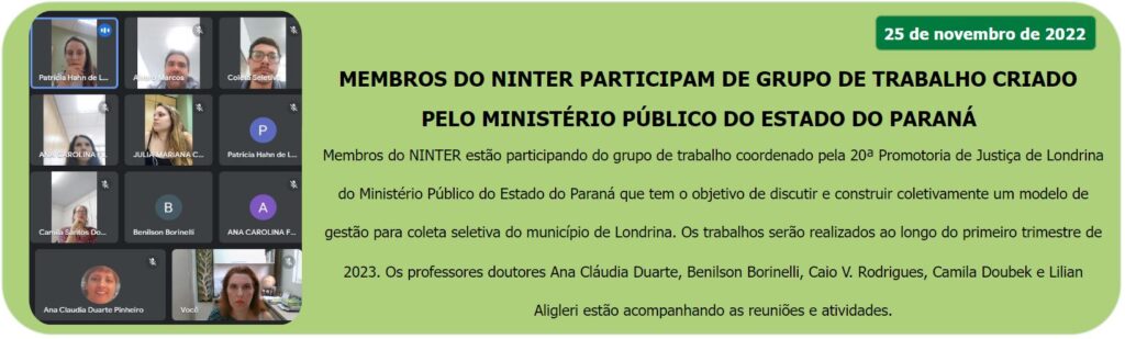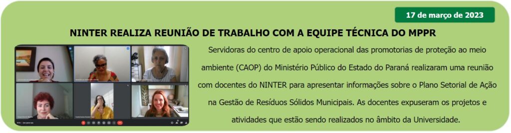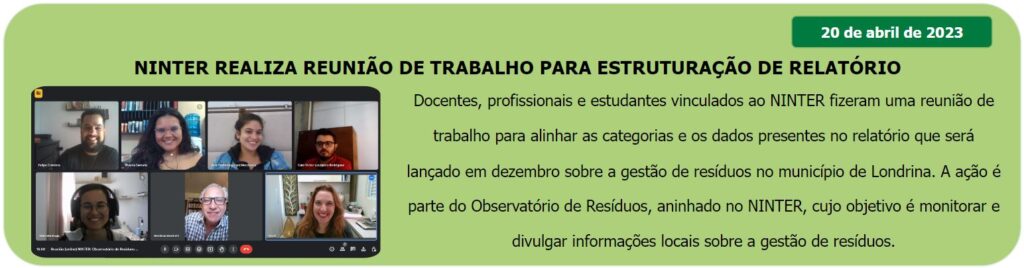 Docentes, profissionais e estudantes vinculados ao Núcleo Interdisciplinar de Estudos e Pesquisas em Resíduos Sólidos (NINTER) participaram da reunião de início das atividades para a produção do 2º Relatório Técnico sobre a Gestão de Resíduos Sólidos Urbanos de Londrina. O relatório, atualmente em estruturação, cobrirá o biênio 2023-2024.