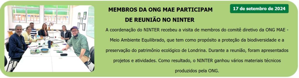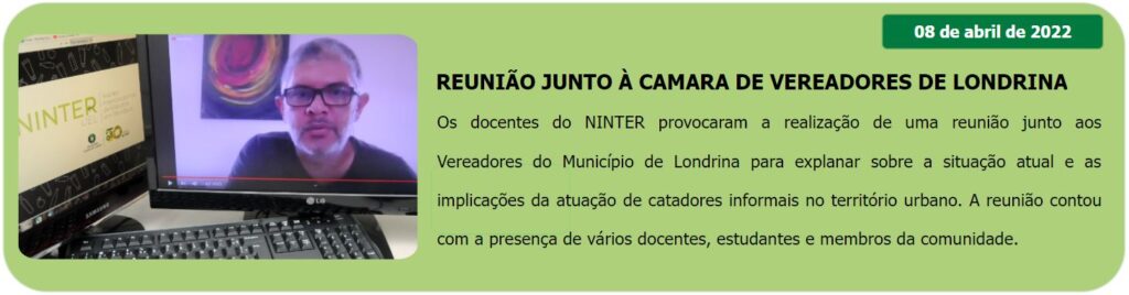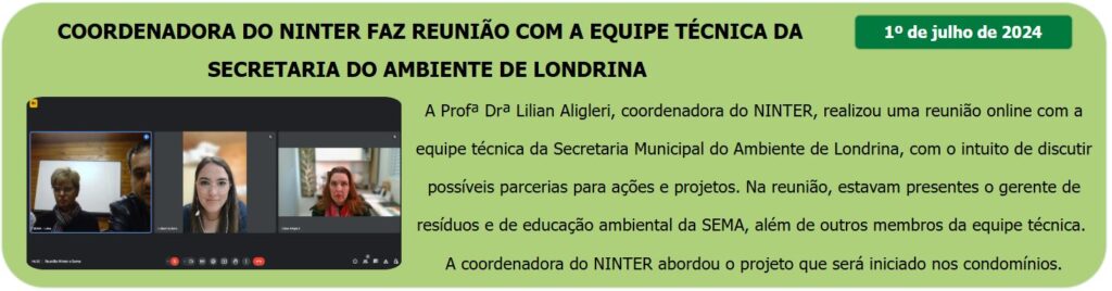 Membros do Núcleo Interdisciplinar de Estudos e Pesquisas em Resíduos Sólidos (NINTER) foram convidados a participar de uma reunião na Secretaria Municipal do Ambiente (SEMA) de Londrina. O propósito foi conhecer as atividades de um verificador de resultados credenciado pelo Ministério do Meio Ambiente para o Sistema Nacional de Logística Reversa. A reunião contou com a apresentação do representante da Greatmob DNC, o Sr. Edivaldo Santos, que detalhou o funcionamento do sistema e suas interações com cooperativas, empresas e entidades gestoras.
