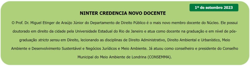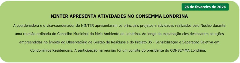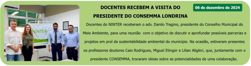 O diálogo interinstitucional é importante para alinharmos as ações acadêmicas do NINTER com as necessidades concretas da gestão ambiental municipal. Este tipo de articulação fortalece a governança de resíduos sólidos em Londrina, transformando pesquisa em impacto direto para a comunidade. Vale destacar que o Prof. Dr. Miguel Etinger, docente do Departamento de Direito Público, também presidiu o CONSEMMA no biênio 2020-2021.
