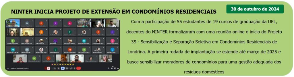 Em 16 de abril ocorreu a reunião online de abertura oficial da 2ª Rodada de Implementação do Projeto 3S – Sensibilização e Separação Seletiva em Condomínios de Londrina. A ação de extensão ofereceu 65 vagas para estudantes colaboradores interessados em participar das atividades por um período de seis meses. Foram selecionados estudantes de 24 diferentes cursos de graduação da Universidade. Nas próximas semanas, os estudantes passarão por um processo de capacitação na temática de resíduos antes de atuarem nos condomínios onde residem.