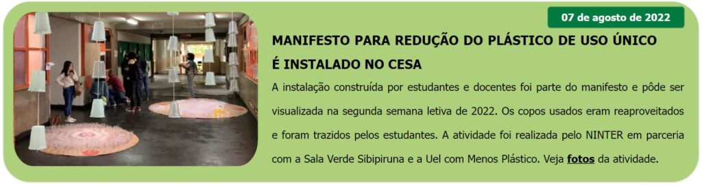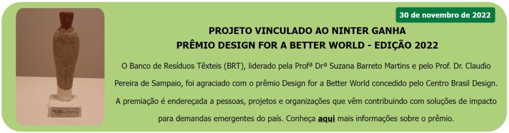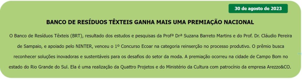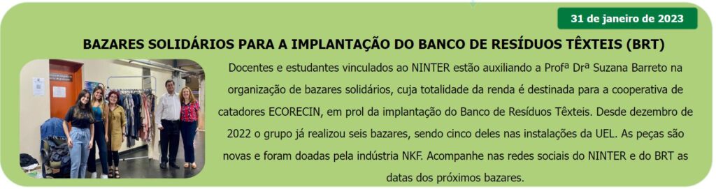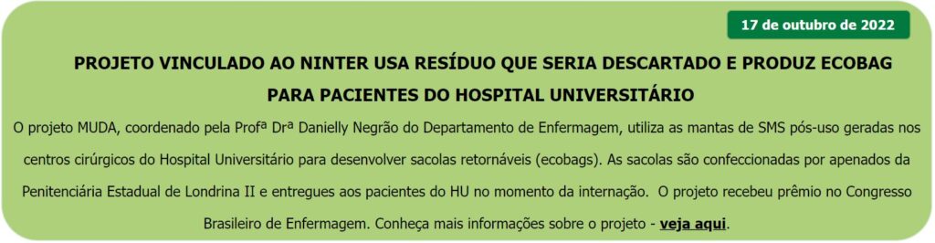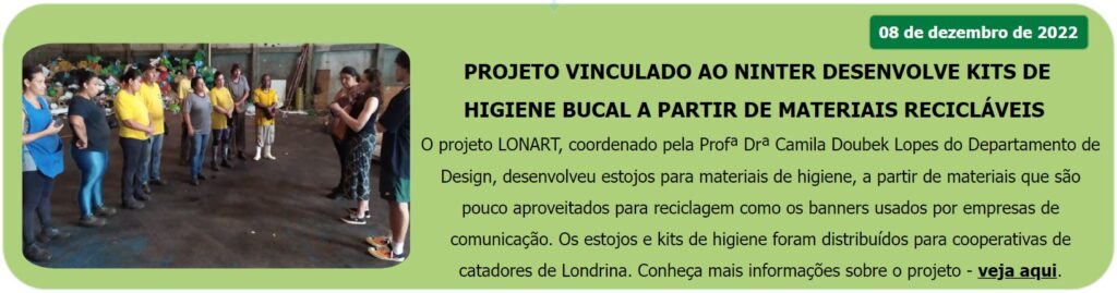 O Lonarte, projeto de extensão vinculado ao NINTER, apresentou três trabalhos na 14º edição do Por Extenso da UEL. O projeto Lonarte realiza o reaproveitamento de lonas e banners de PVC pós-uso para a produção de novos produtos, como bolsas, carteiras e aventais (upcycling). Os trabalhos apresentados são resultados da atuação de duas bolsistas do curso de Design Gráfico.