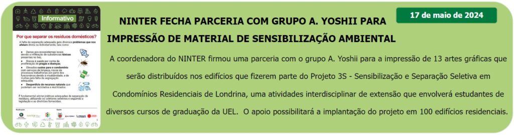 Os informativos impressos serão empregados na próxima rodada de implementação do Projeto 3S – Sensibilização e Separação Seletiva em Condomínios. Vale ressaltar que a 20ª Promotoria de Justiça do Ministério Público do Estado do Paraná é uma das instituições parceiras do projeto.