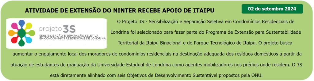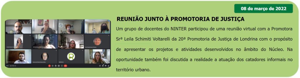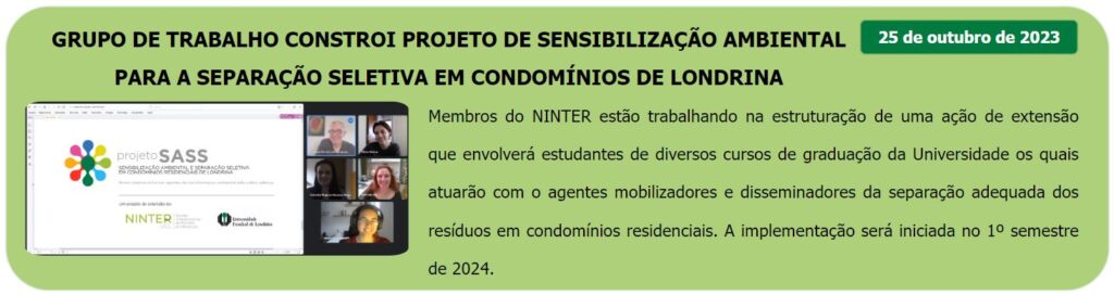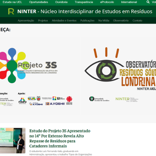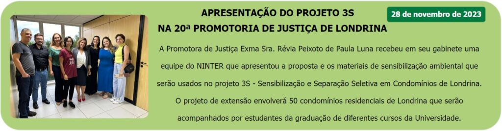 Membros do Núcleo Interdisciplinar de Estudos e Pesquisas em Resíduos Sólidos (NINTER) entregaram o Relatório de Impactos e Resultados do Projeto 3S à Promotora de Justiça Révia Peixoto de Paula Luna, que está à frente da 20ª Promotoria de Justiça do Ministério Público do Estado do Paraná. O relatório detalha as contribuições do projeto na dimensão socioambiental local, bem como nos eixos de extensão e ensino. Além do relatório, foram também disponibilizados à promotoria os resultados de estudos acadêmicos realizados junto aos condomínios e moradores na cidade de Londrina.