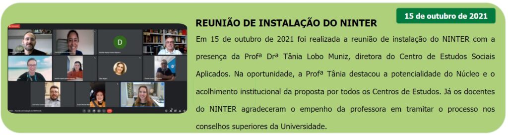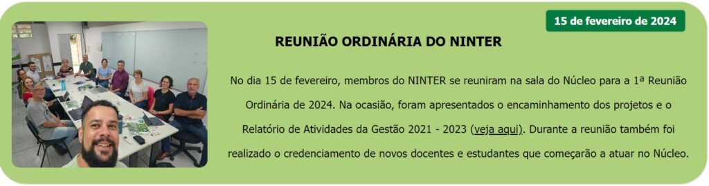A reunião permite assegurar a renovação e a expansão da capacidade técnica e científica do NINTER. É neste momento que se estabelecem as diretrizes e o cronograma de trabalho, garantindo a continuidade e o alinhamento estratégico das ações de pesquisa e extensão para o ano.
