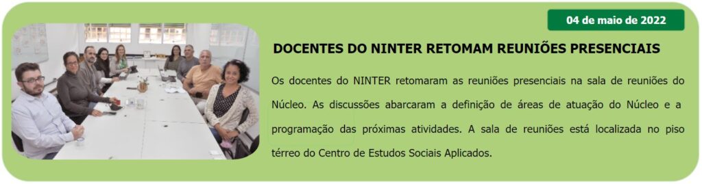 Docentes, estudantes e profissionais vinculados ao NINTER estiveram presentes na 1ª reunião ordinária do ano cujo propósito foi credenciar novos ingressantes ao Núcleo e discutir projetos e atividades em desenvolvimento e em estruturação.