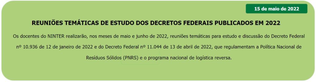 A compreensão aprofundada do Sistema Nacional de Logística Reversa é vital para que o NINTER possa incorporar as diretrizes federais em seus projetos de pesquisa e extensão. Esse diálogo com agentes credenciados no sistema nacional estabelece uma ponte essencial entre a academia e as práticas regulatórias, garantindo a aplicabilidade das soluções propostas pelo Núcleo. Estavam presentes na reunião servidores da SEMA e os representantes do NINTER, a Profª Drª Lilian Aligleri e engenheiro ambiental Ms. Edson Massi.