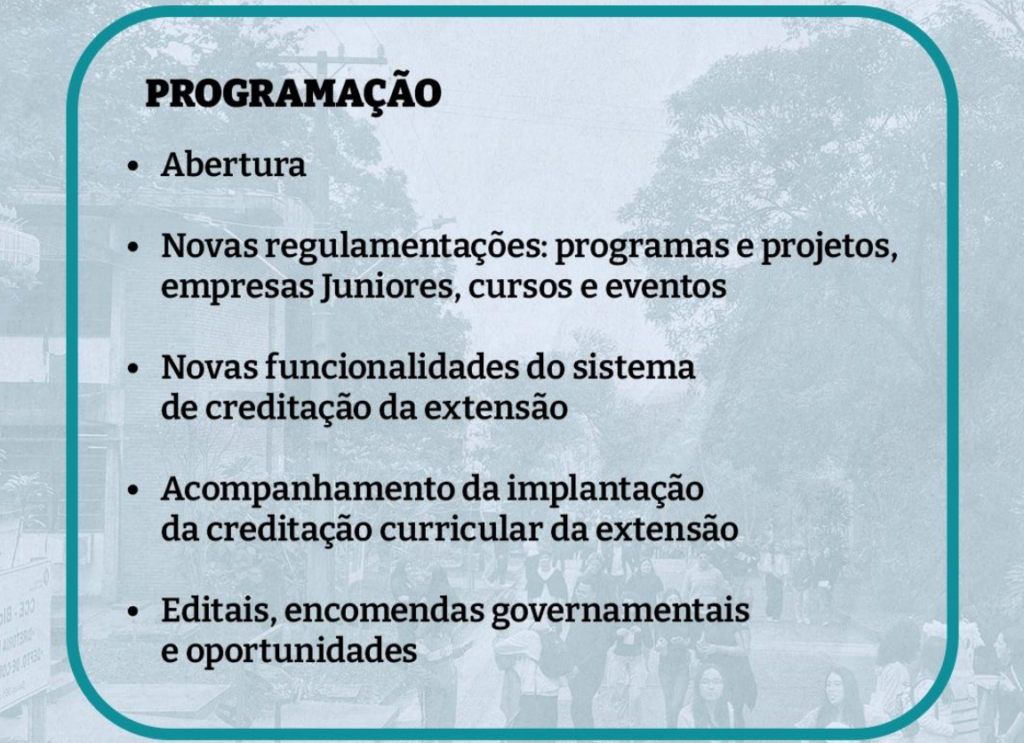 Agora, apresentando as novas Regulamentações de Programas e Projetos, Empresas Juniores, Cursos e Eventos; as Novas Funcionalidades do Sistema de Creditação da Extensão e os Acompanhamento da Implantação da Creditação Curricular da Extensão, além de reforçar a importância da Creditação Curricular da Extensão no âmbito universitário e na formação acadêmica.