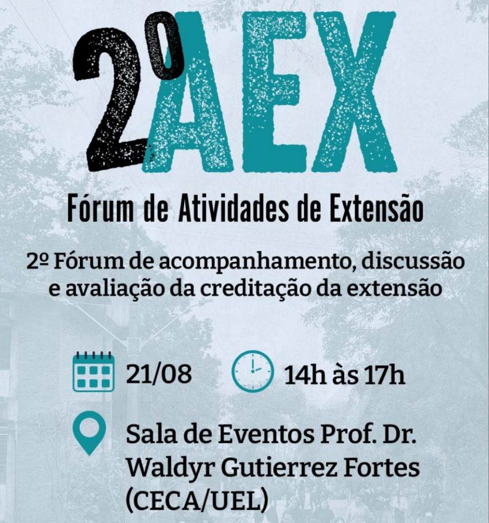 2° FÓRUM AEX UEL – Fórum de Acompanhamento, Discussão e Avaliação da Creditação Curricular da Extensão, chega com sua 2° edição, buscando reforçar a troca conhecimentos e experiências entre docentes, discentes e Coordenadores de Curso e de Extensão, e avaliar o andamento do processo de implantação das AEX dos cursos.