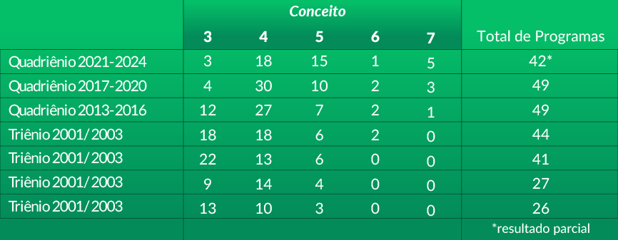 Os mestrados e doutorados podem ser oferecidos na modalidade acadêmica ou profissional. Na UEL hoje, tem-se ao todo 49 Programas de Pós-Graduação, contabilizando 40 mestrados acadêmicos, 7 mestrados profissionais e 34 doutorados acadêmicos reconhecidos pela CAPES (Coordenação de Aperfeiçoamento de Pessoal de Nível Superior). Abaixo segue a evolução do número total de Programas de Pós-Graduação da UEL, e dos conceitos dos mesmos nas avaliações da CAPES desde o triênio 2001/2003 até o último quadriênio (2017-2020).