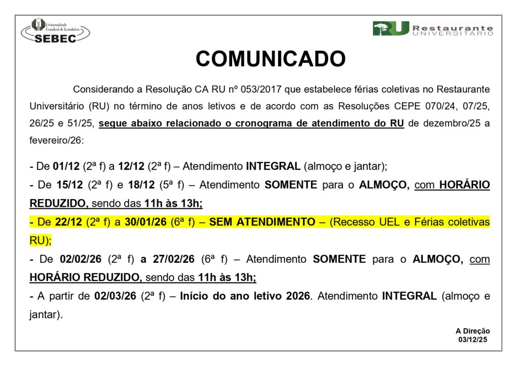 - Para evitar filas nos terminais de autoatendimento (totens) no RU, efetuar a aquisição de créditos online pelo portal do estudante/servidor;