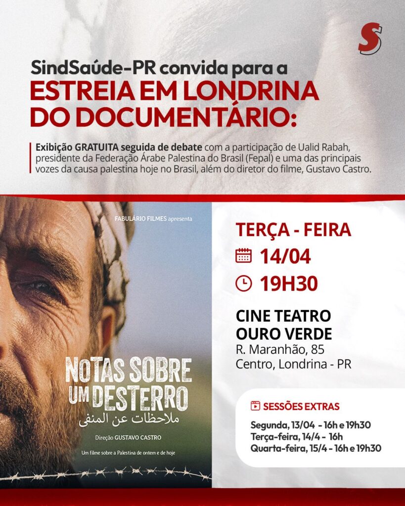 Londrina terá uma exibição especial do documentário paranaense “Notas Sobre um Desterro”, promovida pelo SindSaúde-PR. O filme é apontado como o primeiro longa brasileiro a abordar de forma direta a realidade vivida pelo povo palestino em meio ao conflito em Gaza.